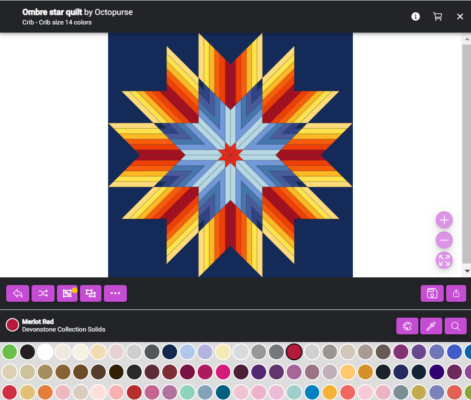 Details: Octopurse first pattern, born from my passion for star quilts and bright colors. Traditional piecing, modern style. It is particularly well suited to solids or blend fabrics. Skill level: intermediate. Have fun!.