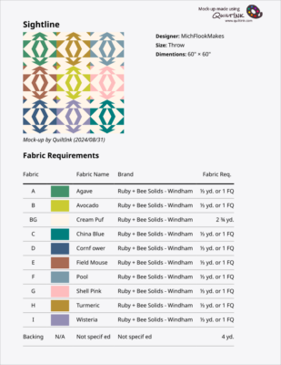In the example you can see the Sightline pattern by Mick Flook Makes, which uses both yards and Fat Quarters in the fabric requirements.