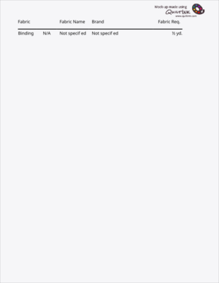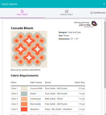 • Exporting Sheet: Once you’ve finished creating your mock-up, the fabric requirements are listed in the exporting sheet. This includes all the colors you used, along with images, names, brands, and the fabric needs, including backing and binding requirements. You can also see if the designer has provided any additional fabric requirements, such as the total number of Fat Quarters. At the bottom of the fabric requirements table, you can find comments from designers, such as whether the fabric requirements are exact or if there’s room for error.