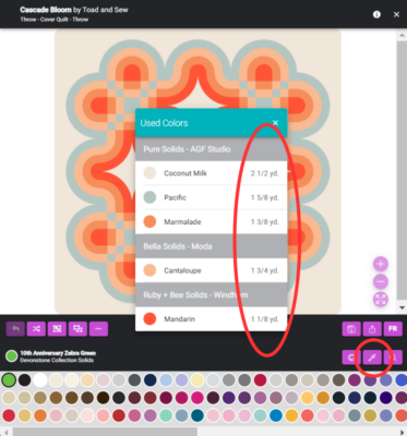 • Color Used Icon: Before you start coloring and while creating your unique version, you can check the fabric needs for each color/fabric used in the mock-up you see on the screen. This is particularly useful if you're planning to use fabrics from your stash and need to ensure you have enough.