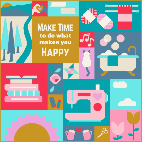 The pattern features block designs around the idea of making time to do what makes you happy.
