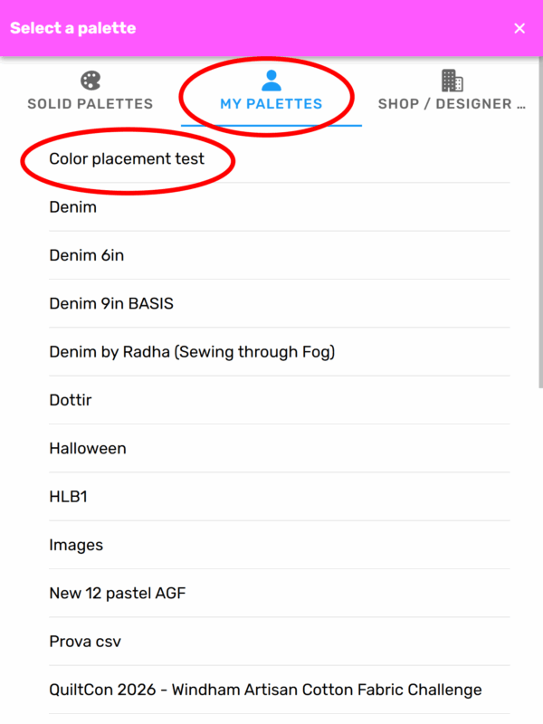 5. Choose the option to add Solids from the QuitlInk Solids palettes. 6. Choose your preferred palette. |