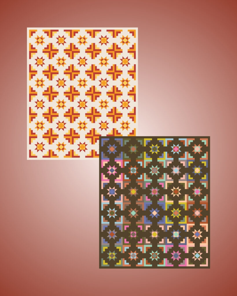 (French for crossroads) this quilt is a modern design beautifully rooted in tradition. A classic crossroads block is scaled up and divided into four streamlined blocks, then pieced in rows for easy assembly — simple, clever, and so effective!