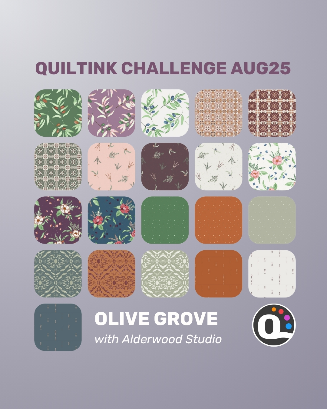 For this challenge, QuiltInk is pleased to present a curated palette of fabrics drawn from the Olive Grove collection by Amber Elliot. This calming array includes soft olive greens, muted teals, herb-toned neutrals, and subtle golden accents—each hue echoing the soothing tones of olive branches beneath warm sunlight.