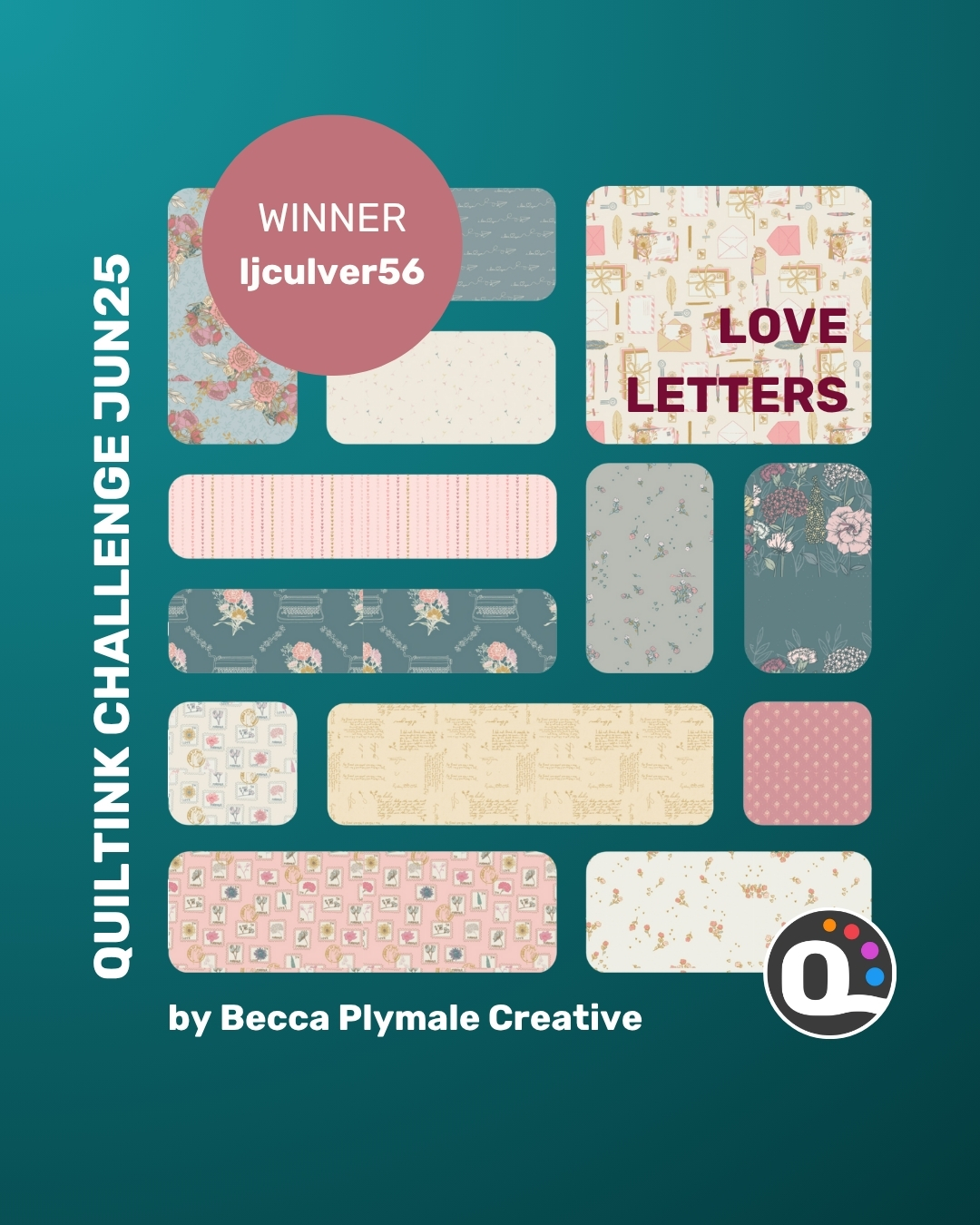 🎉 And now… congratulations to ljculver56, the randomly selected winner of the June Challenge! Your gorgeous mock-ups for the Transcend quilt pattern by Eudaimonia Studios were full of elegance and charm — and you’ve won an 11-piece Fat Quarter bundle of the Love Letters fabric collection! (The winner will receive an email from us)